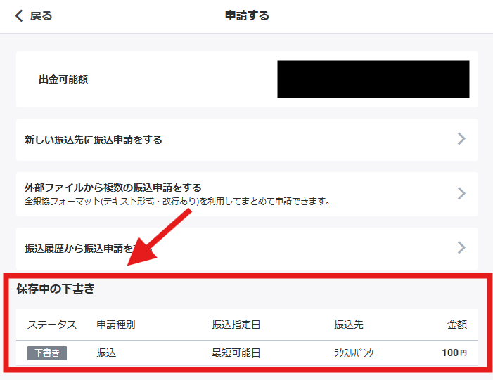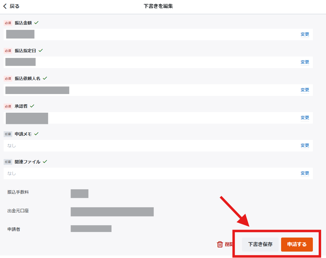 これまで選択・入力した内容が表示されます。振込申請する内容に問題がないか確認してください。